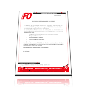 La fédération FO des Cheminots apporte par ce communiqué, tout son soutien aux camarades de FO RATP et plus largement aux agents RATP du RER dans leur action légitime de contestation par la grève notamment ce samedi 28 mai.