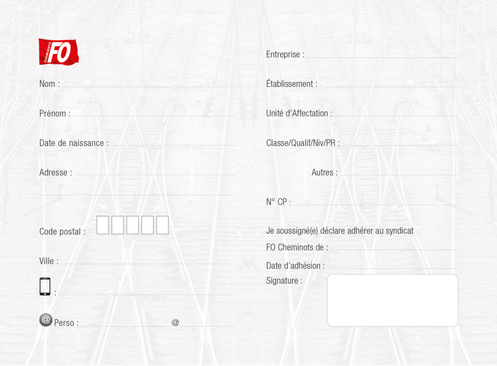 Si vous souhaitez adhérer à FO Cheminots, vous êtes au bon endroit. Vous trouverez sur cette page le bulletin d’adhésion à télécharger et imprimer que vous remettrez à un représentant local de votre secteur.