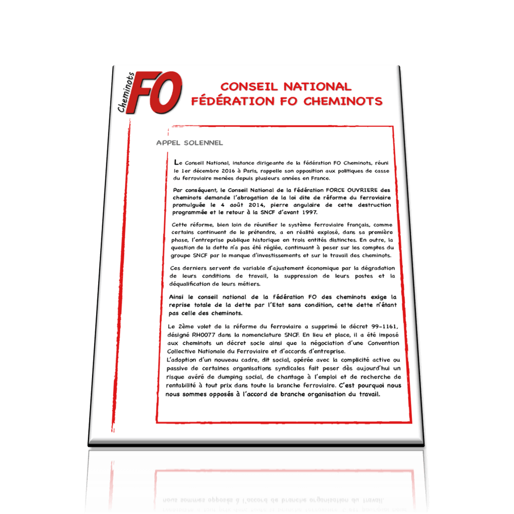CONSEIL NATIONAL DE LA FEDERATION FO DES CHEMINOTS DU 1ER DECEMBRE 2016 : APPELS SOLENNELS