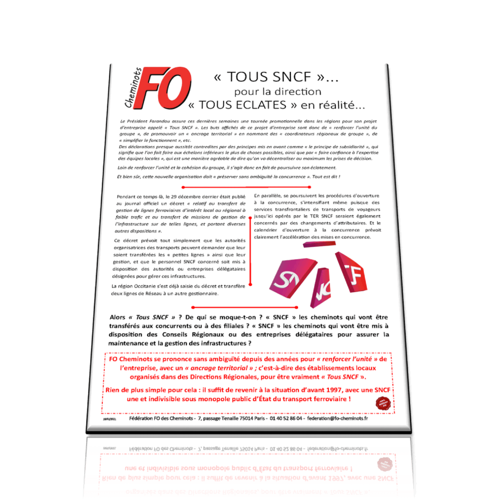 Le Président Farandou assure ces dernières semaines une tournée promotionnelle dans les régions pour son projet d’entreprise appelé « Tous SNCF ». Loin de renforcer l’unité et la cohésion du groupe, il s’agit donc en fait de poursuivre son éclatement.